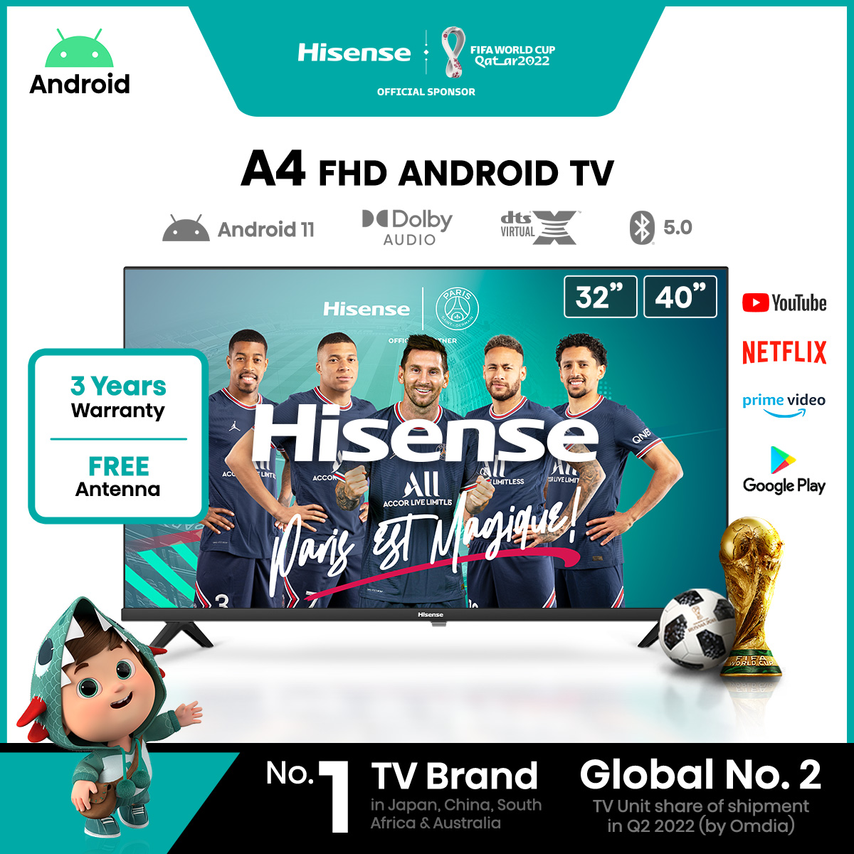 Hisense A4 32" 40'' Android TV | Google Play | Android 11 | Dual Wifi 2.4+5G | DTS Virtual X | Dolby Audio | Bezelless | Smart TV | Bluetooth Remote | Youtube | Netflix | Disney+ | Google voice contro