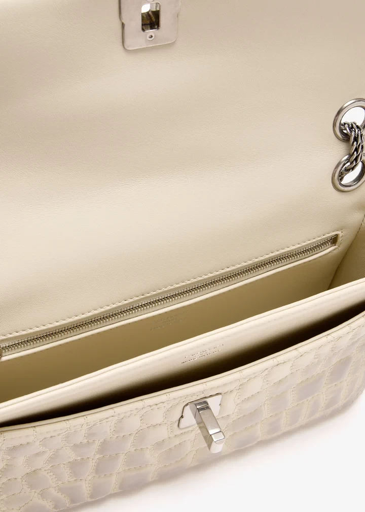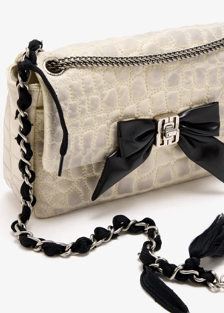The Clémence bag channels vintage structure with a subversive edge. Quilted to mimic crocodile leather, it features distressed finishes, BB Nano hardware, a bow detail, and layered straps, clashing elements that come together in true Balenciaga form.
