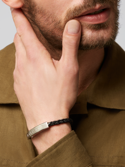 BLACK BRAIDED CALFSKIN AND RUBBER MEN'S BRACELET FROM BULGARI BULGARI COLLECTION. THIS BRACELET FEATURES A SILVER BUCKLE ADORNED WITH THE ICONIC BULGARI LOGO ON THE FRONT, ADDING A UNIQUE TOUCH TO EVERYDAY LOOKS. 17.5 CM - 6.9 INCHES (WRIST CIRCUMFERENCE). MADE IN ITALY.