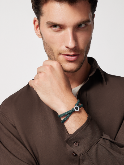 BULGARI BULGARI MEN'S FOREST EMERALD GREEN WOVEN CALFSKIN BRACELET. THIS BRACELET IS COMPLEMENTED BY THE SERIES' CLASSIC DECORATION, EMBELLISHED WITH MATTE BLACK ENAMEL AND THE ICONIC DOUBLE LOGO, ADDING A STRIKING STYLE TO EVERYDAY LOOKS. SNAP CLOSURE. 18.5 CM - 7.3 INCHES (WRIST CIRCUMFERENCE). MADE IN ITALY.