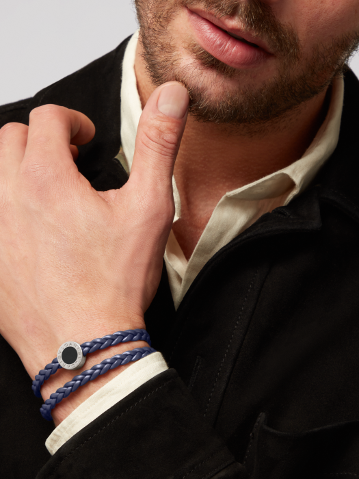 BULGARI BULGARI MEN'S POSEIDON GOLD STONE BLUE BRAIDED CALFSKIN BRACELET. THIS BRACELET IS COMPLEMENTED BY THE SERIES' CLASSIC DECORATION, EMBELLISHED WITH MATTE BLACK ENAMEL AND THE ICONIC DOUBLE LOGO, ADDING A STRIKING STYLE TO EVERYDAY LOOKS. SNAP CLOSURE. 17.5 CM - 6.9 INCHES (WRIST CIRCUMFERENCE). MADE IN ITALY.
