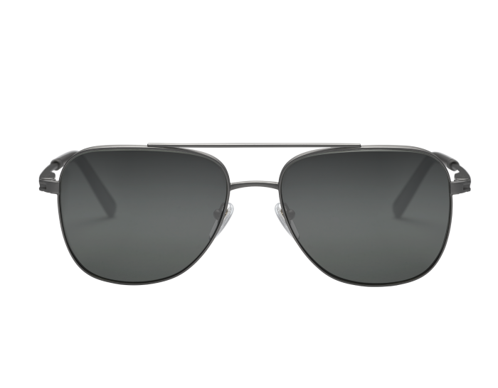 BULGARI BULGARI ALUMINUM SUNGLASSES IN AVIATOR FRAME WITH GRAY POLARIZED LENSES. THESE SUNGLASSES ARE ENGRAVED WITH THE BRAND'S SIGNATURE LOGO AT THE TOP OF THE ALUMINUM TEMPLES.