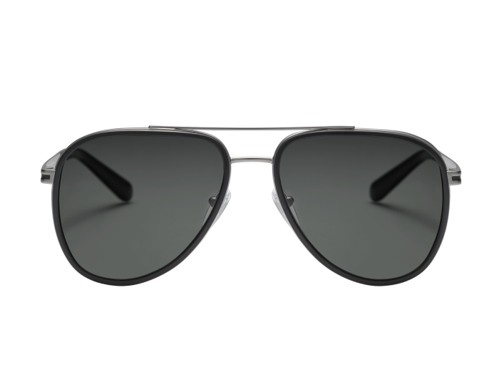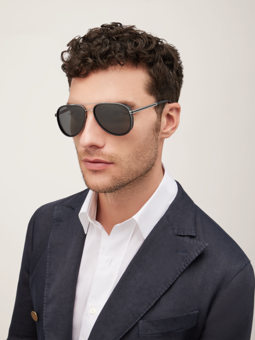 BULGARI BULGARI MEN'S SUNGLASSES WITH AVIATOR FRAME AND GRAY POLARIZED LENSES WITH ACETATE SPOILER AND SPORTY DOUBLE BRIDGE DESIGN, GRAPHIC TEMPLES WITH ENAMEL INLAYS.