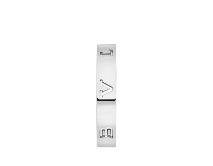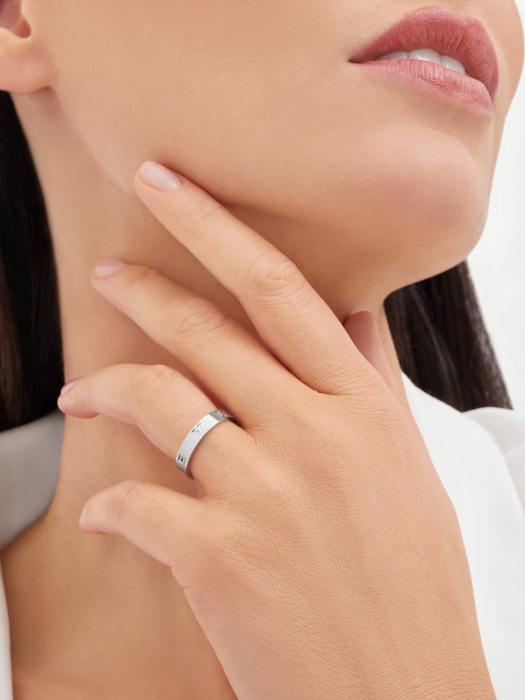 THE BULGARI BULGARI SERIES OF 18K WHITE GOLD RINGS IS ROOTED IN BULGARI'S ROMAN HISTORY, PRESENTING A MEANINGFUL BLEND OF CULTURE AND MODERNITY, SHOWING CONTEMPORARY ELEGANCE. THE LOGO OF THIS SERIES IS INSPIRED BY THE CURVED INSCRIPTIONS ON ANCIENT ROMAN COINS, AND HAS BEEN REINTERPRETED TO ACHIEVE A UNIQUE AND CLASSIC DESIGN ELEMENT. FASHIONABLE AND VERSATILE, THIS RING CAN BE MIXED AND MATCHED AS YOU LIKE.