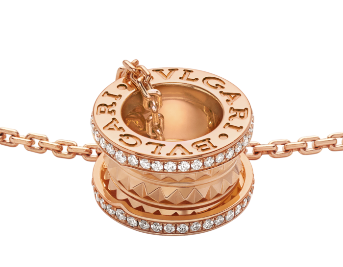 THE B.ZERO1 ROCK SERIES 18K ROSE GOLD NECKLACE DRAWS INSPIRATION FROM THE FAMOUS AMPHITHEATRE, THE COLOSSEUM, AND DEMONSTRATES BULGARI'S UNIQUE, BOLD AND UNINHIBITED CREATIVE PERSPECTIVE IN A GROUNDBREAKING WAY. THE COLLECTION'S CLASSIC, PURE SPIRAL SHAPE, EXPRESSED THROUGH THE STRONG LINES OF THE PENDANT, IS REINTERPRETED WITH GOLD-TONE STUDS, EDGED WITH PAVÉ PRECIOUS DIAMONDS, EMPHASIZING THE UNINHIBITED NATURE OF THIS INNOVATIVE DESIGN MASTERPIECE.