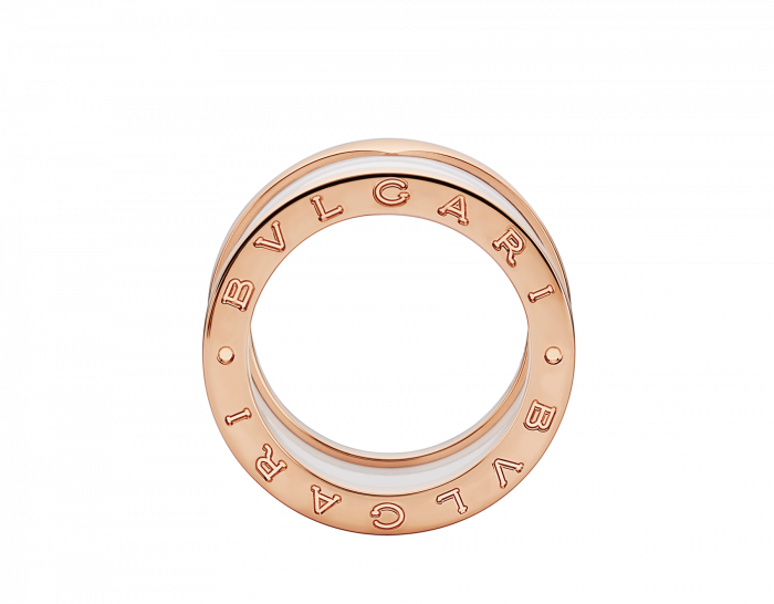 DRAWING INSPIRATION FROM THE WORLD-FAMOUS AMPHITHEATRE, THE COLOSSEUM, THE B.ZERO1 RING TRULY DEMONSTRATES BULGARI'S CREATIVE VISION AND CHALLENGES THE VERY ESSENCE OF JEWELRY DESIGN. ITS UNIQUE AND PURE SPIRAL SHAPE SYMBOLIZES THE HARMONY OF PAST, PRESENT AND FUTURE - WHICH IS REFLECTED IN THE SPLENDOR OF THE ETERNAL CITY - AND THE PIONEERING SPIRIT OF THE COLLECTION. B.ZERO1 FOUR-BAND RING IN 18K ROSE GOLD DECORATED WITH WHITE CERAMIC