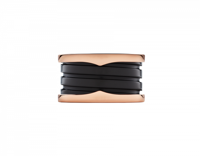 DRAWING INSPIRATION FROM THE WORLD-FAMOUS AMPHITHEATRE, THE COLOSSEUM, THE B.ZERO1 RING TRULY DEMONSTRATES BULGARI'S CREATIVE VISION AND CHALLENGES THE VERY ESSENCE OF JEWELRY DESIGN. ITS UNIQUE AND PURE SPIRAL SHAPE SYMBOLIZES THE HARMONY OF PAST, PRESENT AND FUTURE - WHICH IS REFLECTED IN THE SPLENDOR OF THE ETERNAL CITY - AND THE PIONEERING SPIRIT OF THE COLLECTION. B.ZERO1 FOUR-BAND RING IN 18K ROSE GOLD DECORATED WITH BLACK CERAMIC