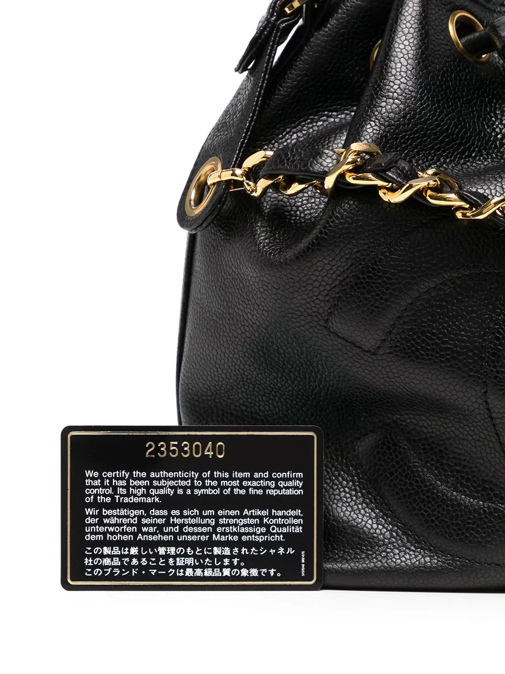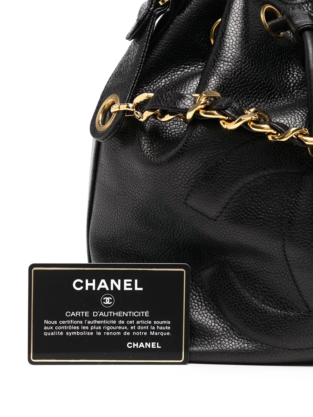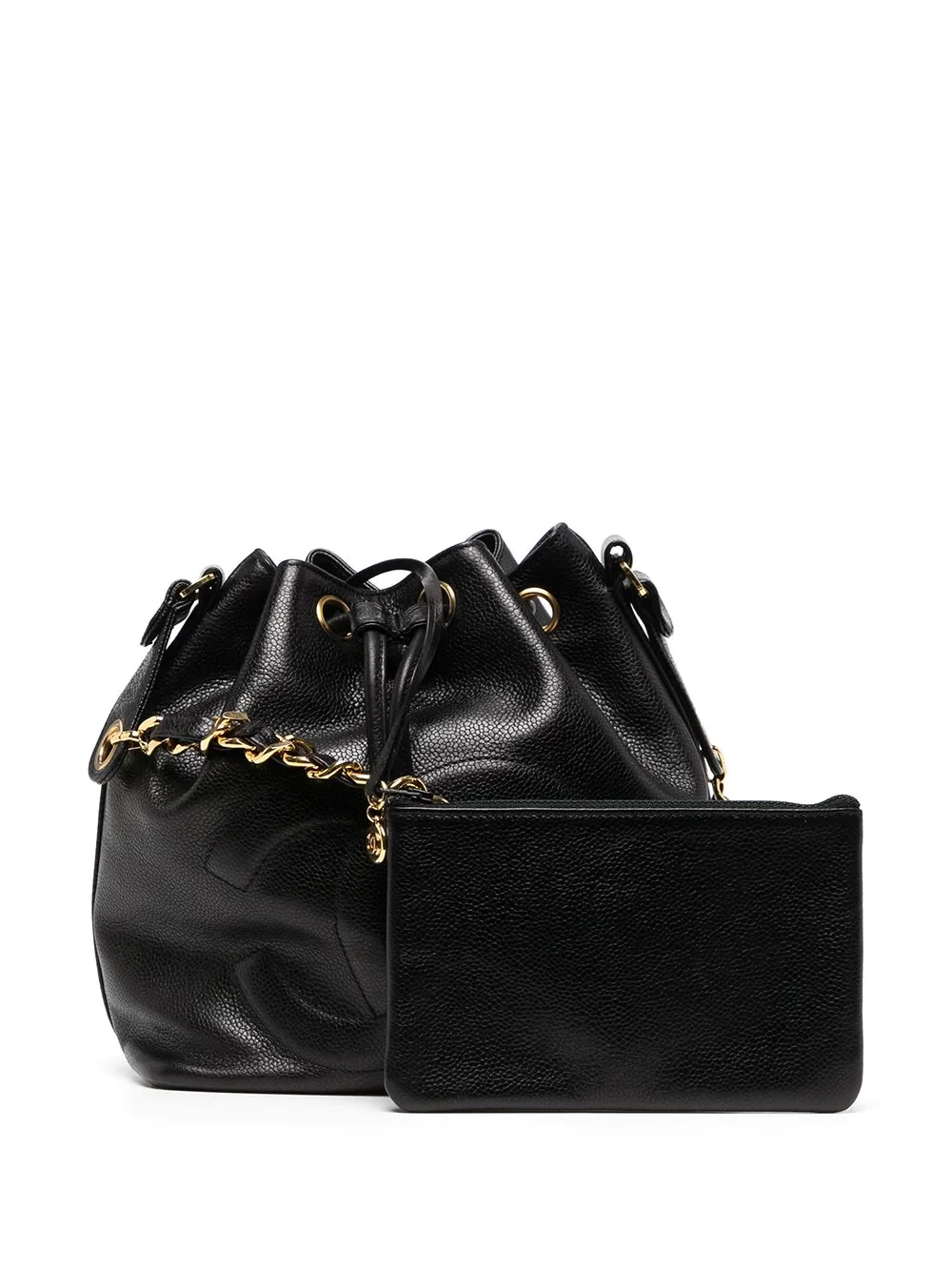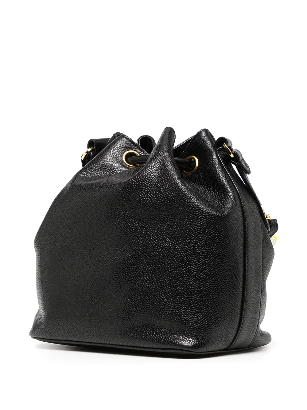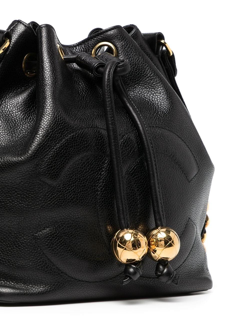 The bucket bag is made of black caviar leather and the front outlines the iconic logo with stitching details.