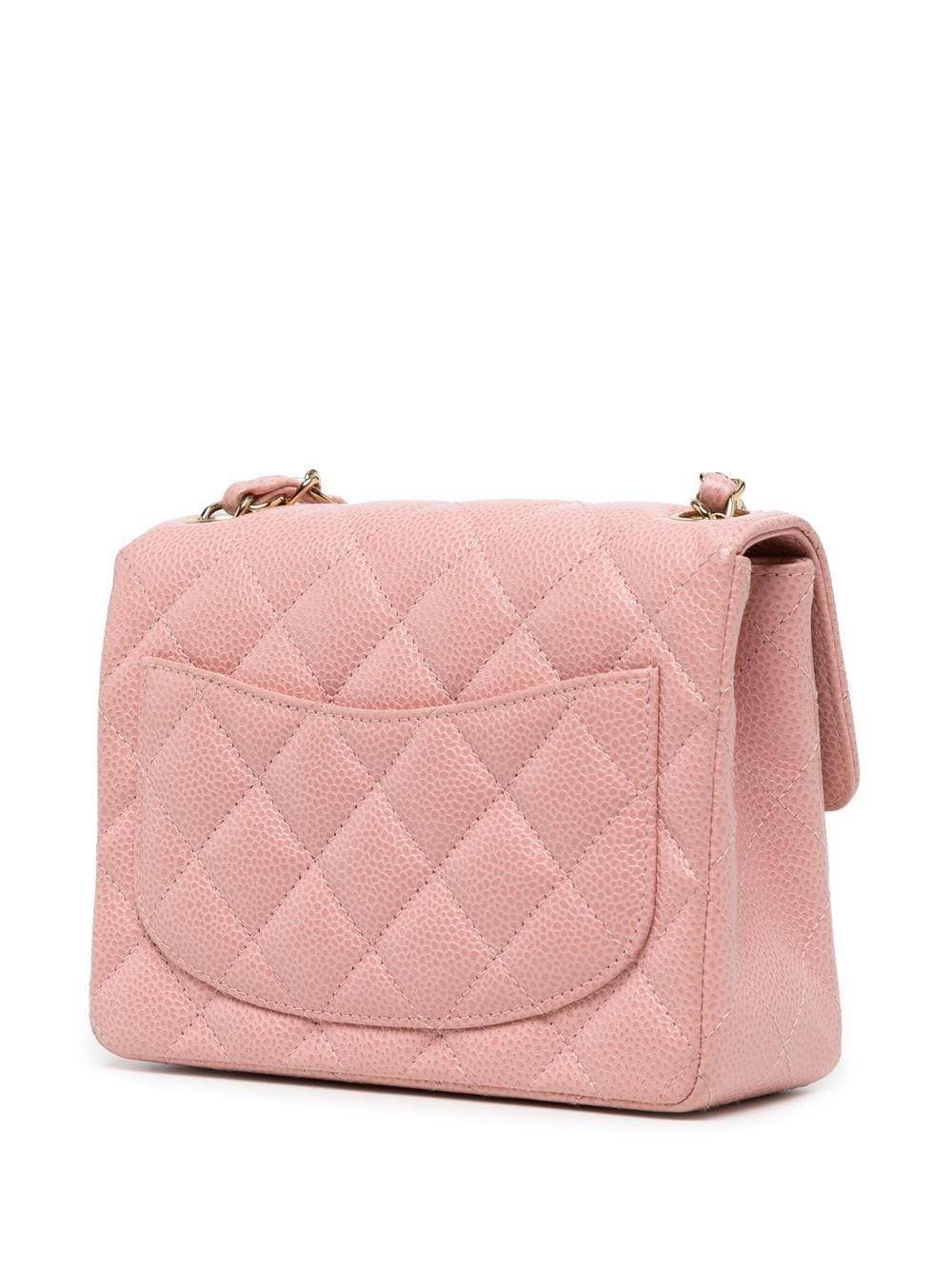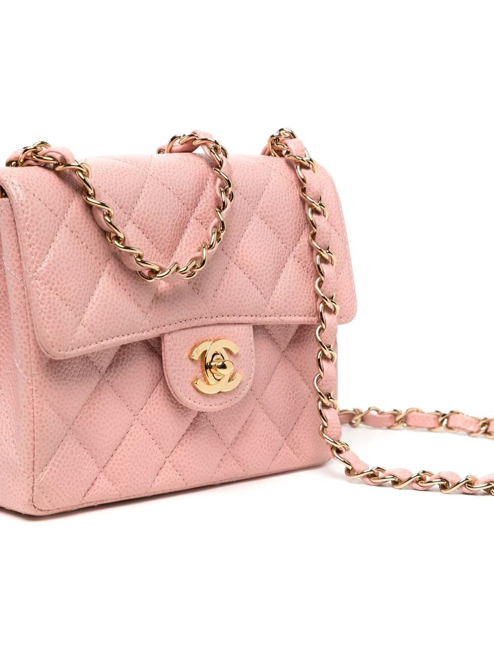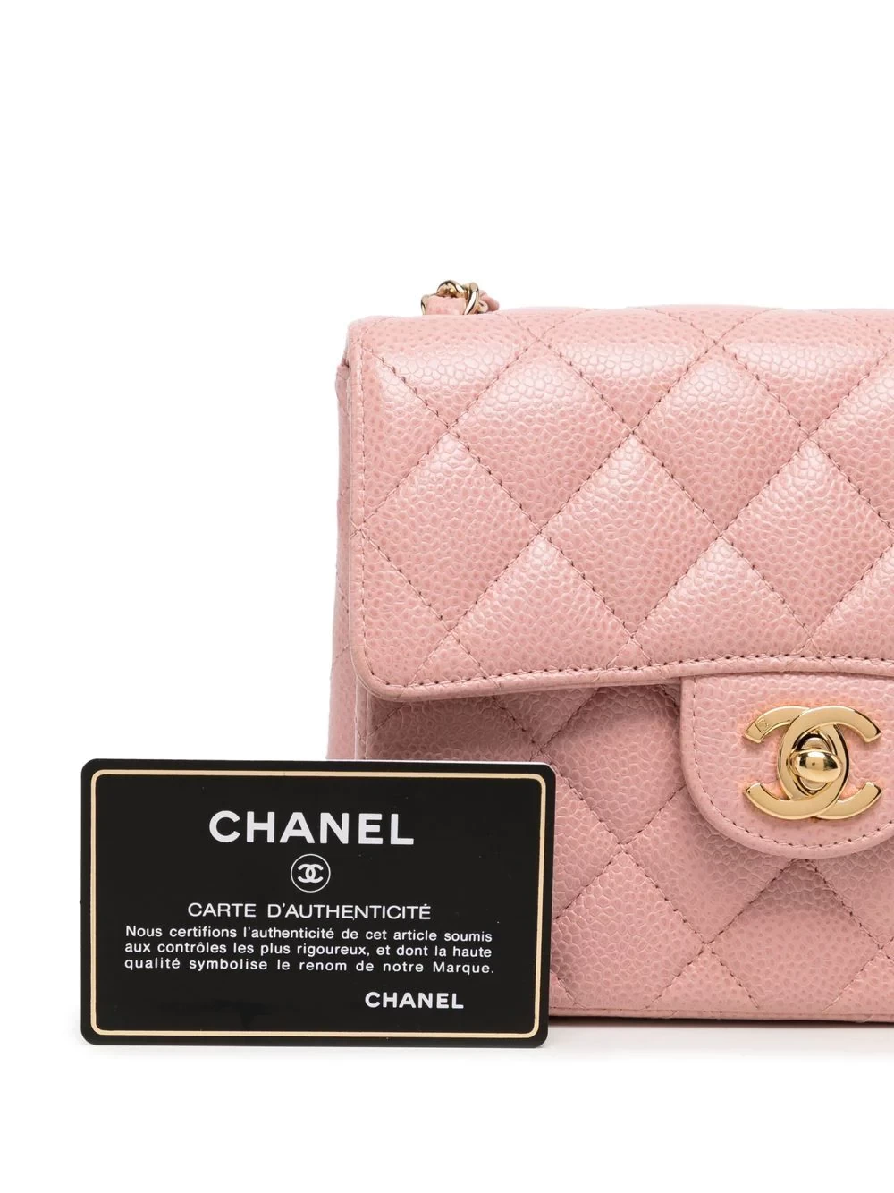 Blush powder, diamond quilting, top flip, iconic CC buckle, removable leather chain shoulder strap, built-in logo tag, built-in zipper pocket, leather lining, gold hardware, square.