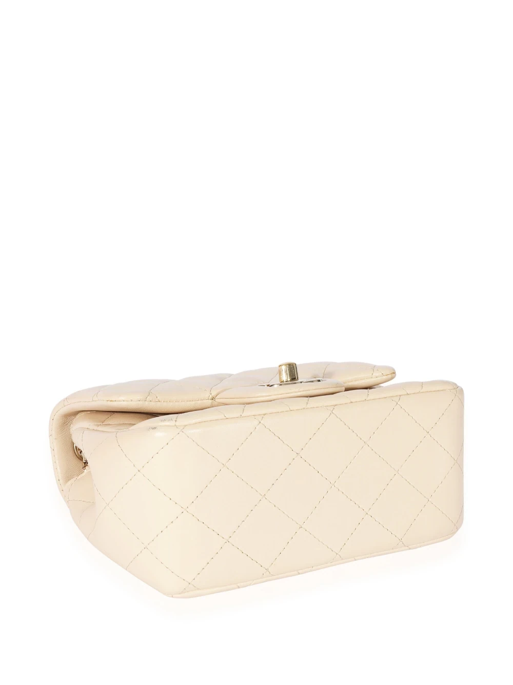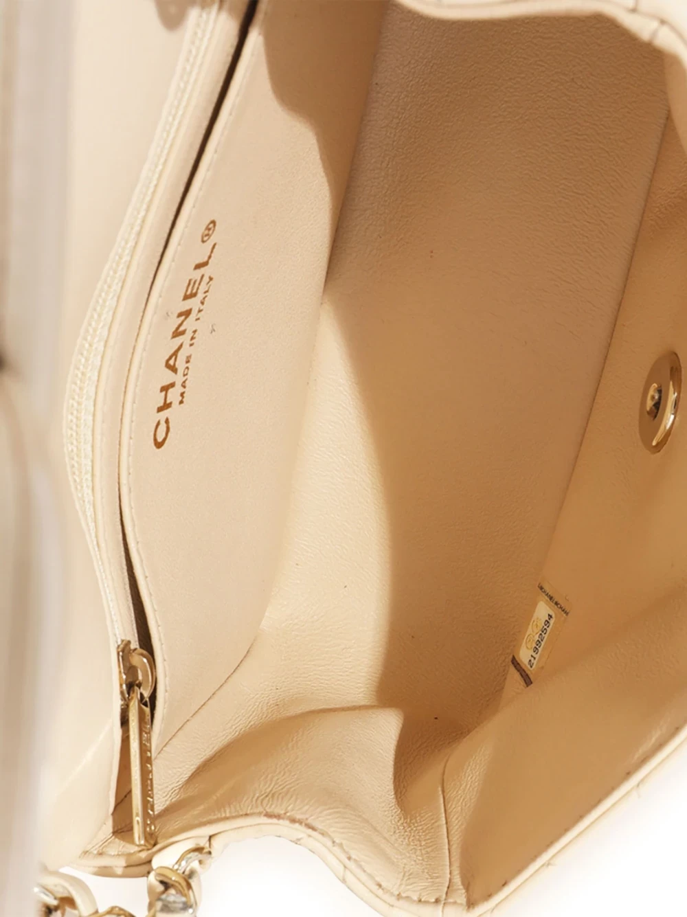 Light beige, lambskin, diamond quilted, leather chain shoulder straps, top flip, iconic CC buckle, built-in zipper pocket, built-in patch bag, built-in logo mark, leather lining, gold hardware accessories, rectangle.