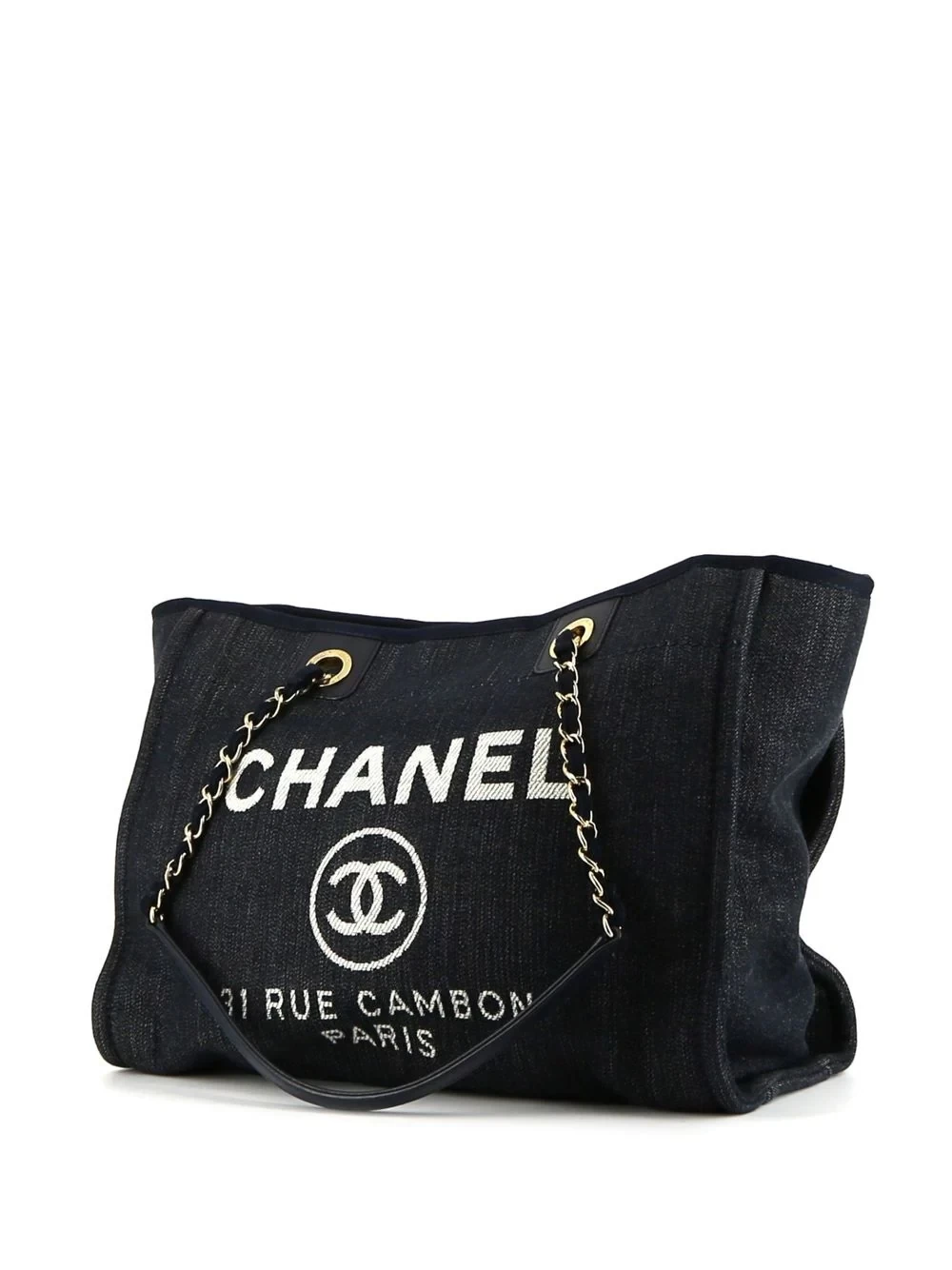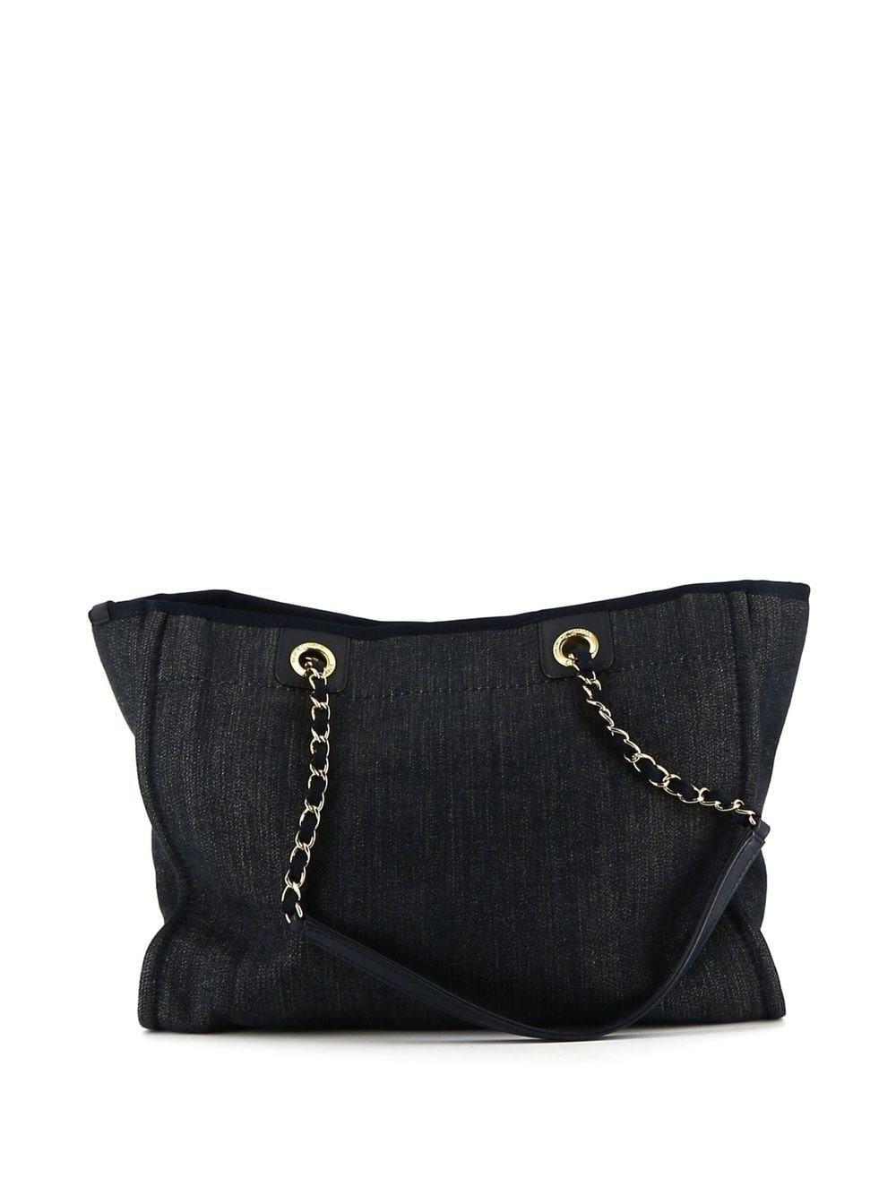 Design details: blue, iconic Rue Cambon address embroidery, buckle, main mezzanine, built-in zipper pocket, multiple built-in pockets, two leather chain top handles.