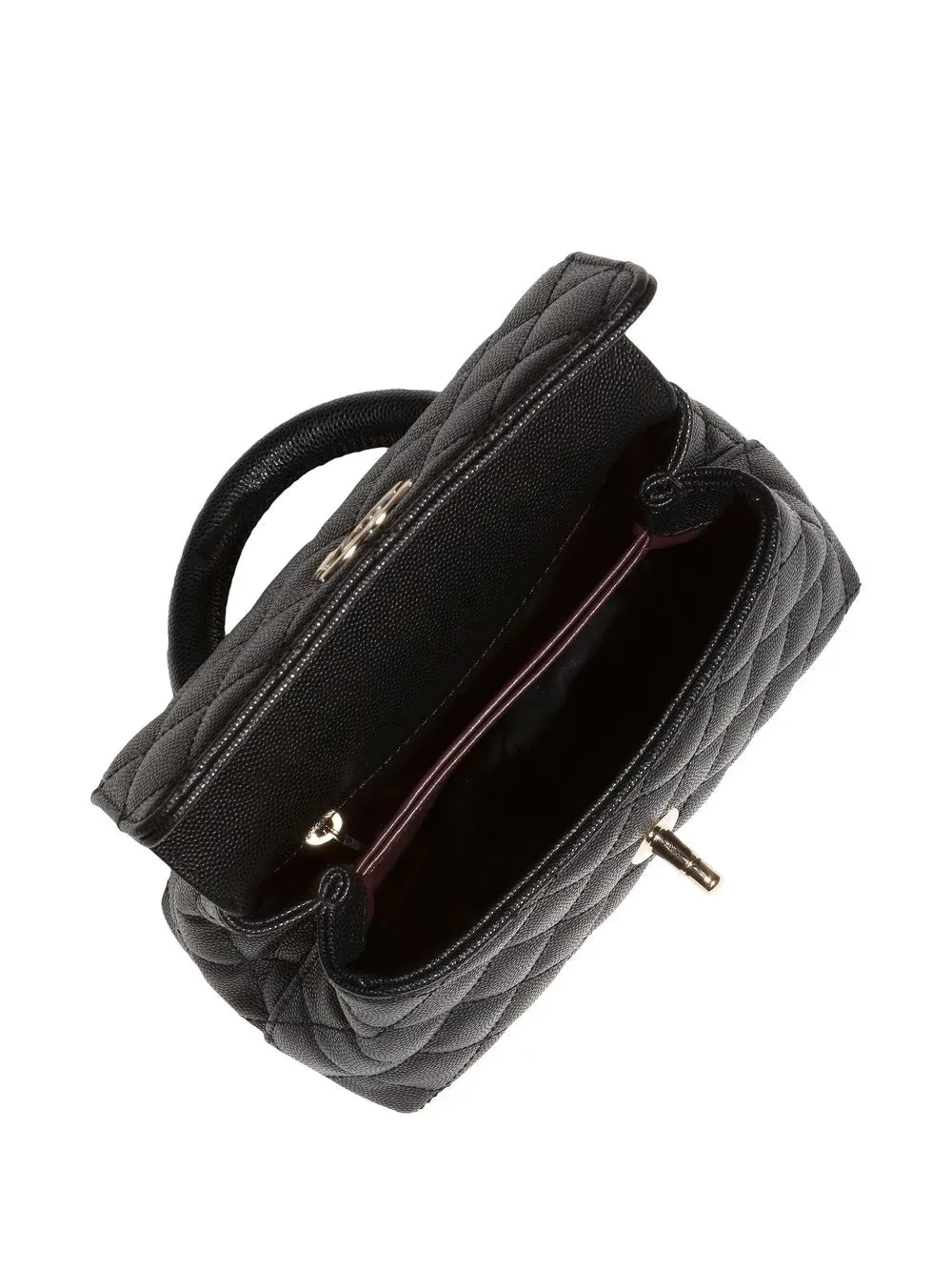 Black, caviar leather, iconic cross buckle CC buckle pendant, diamond quilting, a round handle, top flip, partition compartment, built-in zipper pocket, rear pocket, gold hardware accessories.