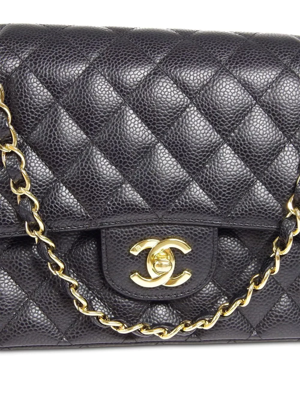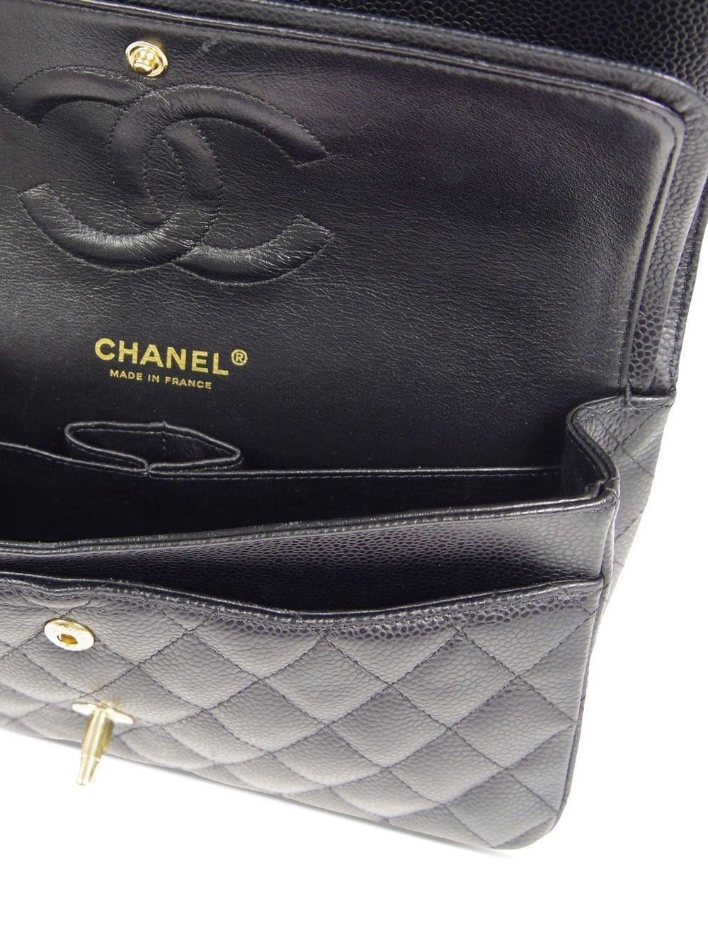 Black, caviar leather, diamond quilted, iconic CC buckle, iconic double flip design, front pocket, partition compartment, multiple built-in pockets, rear pockets, adjustable leather chain straps.