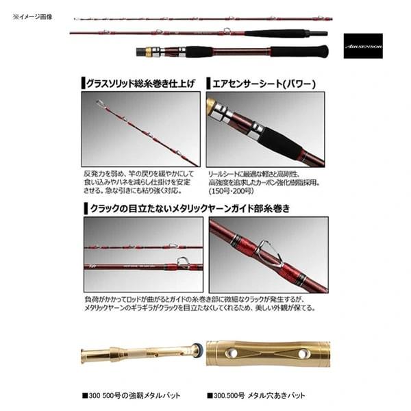 Sticky and strong glass-solid all thread-wrapped rod for mid-to-deep range. By moderately suppressing the repulsive force of the blank, a tenacious tone is achieved, and the valuable bite is firmly bitten into the hook without repelling it, and when hoisting, the stickiness prevents it from falling apart. The guides are HB guides that emphasize strength, lightweight carbon bats that emphasize ease of handling for Nos. 150 and 200, and tough metal bats for Nos. 300 and 500. Reliable Daiwa technology rod that can reach the longed-for target hidden in the deep sea.