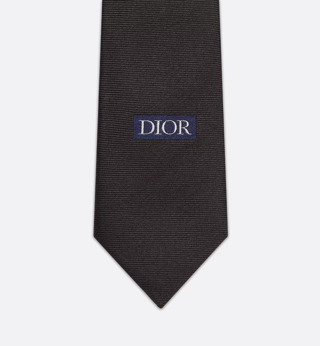 New for Winter 2025, the black tie showcases a gray archive-inspired Diorling signature in celebration of Dior's heritage, sitting below the knot. Crafted in silk, the refined tie will enhance any suit with a graphic touch.
