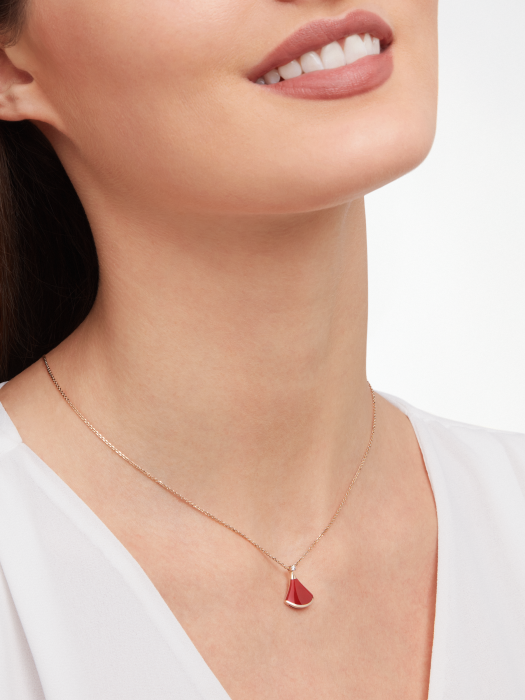INSPIRED BY FEMININE ELEGANCE AND THE ALLURE OF THE ETERNAL CITY, THE DIVAS' DREAM NECKLACE PAYS HOMAGE TO THE MOST GLAMOROUS WOMEN WITH A UNIQUE ROMAN SPIRIT. FEMININE AND REFINED, THIS NECKLACE EMBODIES THE RICHNESS OF THE BATHS OF CARACALLA MARBLE AND THE ALLURING CURVES OF THE SCALLOPED MOSAICS, THE TRUE ESSENCE OF ITALIAN AESTHETICS. DIVAS' DREAM NECKLACE IN 18K ROSE GOLD, SET WITH CARNELIAN AND DIAMONDS. LENGTH 16-17 INCHES (41-43 CM).