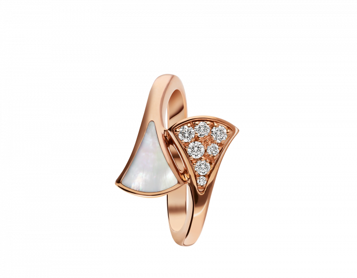 THE DIVAS' DREAM SERIES RINGS DRAW INSPIRATION FROM THE ELEGANCE OF WOMEN AND THE CHARM OF THE ETERNAL CITY, PAYING TRIBUTE TO CHARMING WOMEN WITH A UNIQUE ROMAN SPIRIT. FEMININE AND REFINED, THIS RING EXPRESSES THE RICHNESS OF THE CARACALLA BATHS MARBLE AND THE ALLURING CURVES OF THE SCALLOPED MOSAICS, THE TRUE ESSENCE OF ITALIAN AESTHETICS.