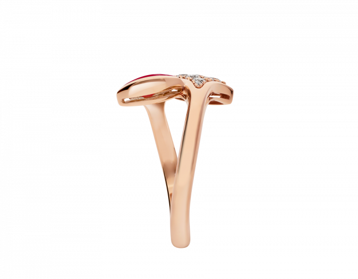 THE DIVAS' DREAM SERIES OF RINGS EMBODIES THE ELEGANT CHARM OF ITALIAN STYLE, RELEASING THE POWER OF WOMEN WITH MYSTERIOUS AND UNFORGETTABLE TEMPERAMENT. THE GLAMOROUS AND EXQUISITE RING IS DECORATED WITH A FAN-SHAPED PATTERN, WHICH DRAWS INSPIRATION FROM THE MOSAIC DECORATION OF THE BATHS OF CARACALLA IN ROME (BATHS OF CARACALLA), AND HIGHLIGHTS THE RELATIONSHIP BETWEEN BVLGARI AND THE "ETERNAL CITY" ROME WITH MODERN FASHION DESIGN AND EXQUISITE GEMSTONE COMBINATION. HISTORICAL ORIGINS. DIVAS' DREAM RING IN 18K ROSE GOLD SET WITH CARNELIAN AND PAVÉ DIAMONDS.