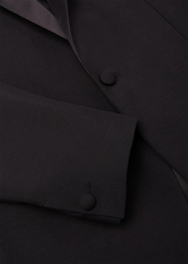 This single-breasted blazer is crafted from a wool and mohair blend for an elegant evening look. Designed in a tailored silhouette, it features a button closure and a peak collar.