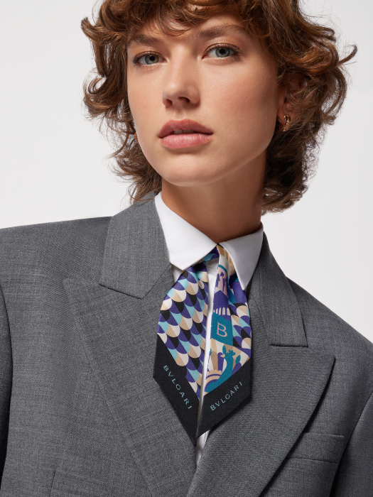 THE ROMAN GROUND SERIES MINI SHAWL, MADE OF BLACK FINELY PRINTED TWILL SILK MATERIAL, PAYS TRIBUTE TO BULGARI'S ENDLESS SOURCE OF INSPIRATION - THE GLORIOUS ROME. THE PATTERNS OF THE WORKS SHOW THE RICH CULTURAL HERITAGE OF THE BRAND, FROM THE MOSAICS THAT LIGHT UP THE INSPIRATION OF THE DIVAS' DREAM SERIES TO THE LEGENDARY COLOSSEUM, AS WELL AS THE CLASSIC ARCHITECTURAL ELEMENTS AND LANDSCAPES OF ROME AND BULGARI'S ICONIC SYMBOLS, SUCH AS THE SNAKE AND THE PEACOCK, PRESENTING AN FANTASTIC "GRAND PARADE". THIS PIECE IS EXTREMELY VERSATILE AND STYLISH: IT CAN BE TIED AROUND THE NECK OR WRIST, WORN AS A HAIR ACCESSORY, OR ADORNED WITH A BAG OR HAT. 5 X 85 CM - 2 X 33.5 IN. HANDMADE IN ITALY.