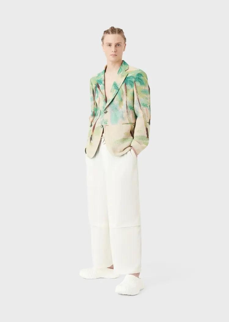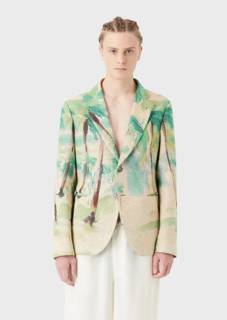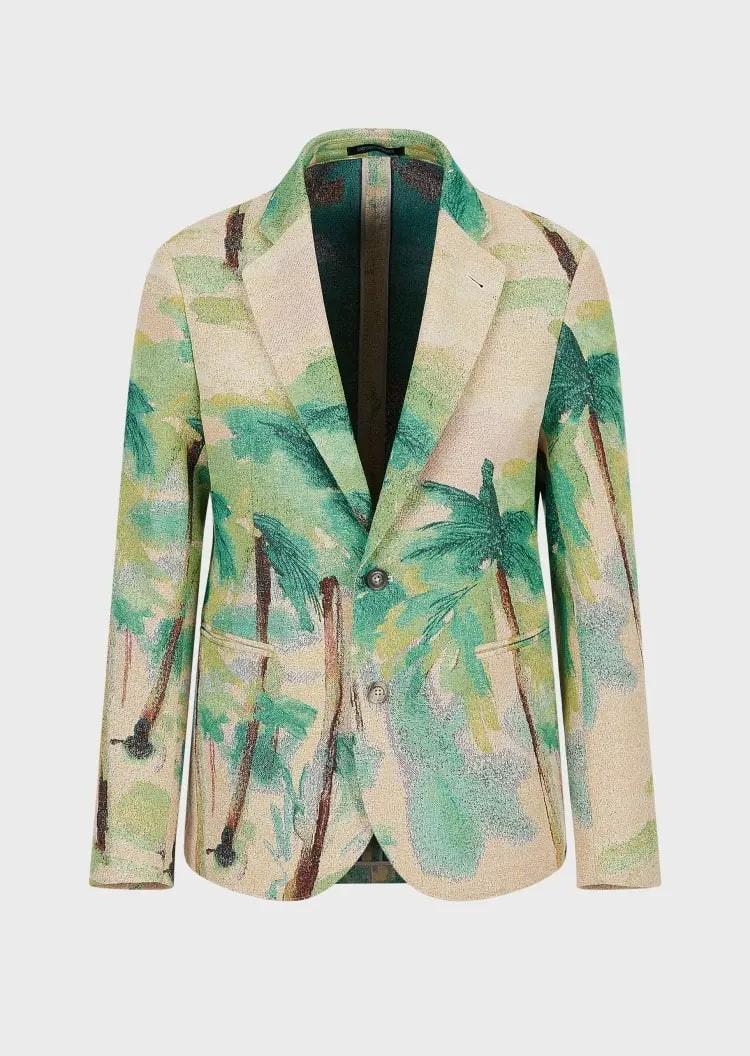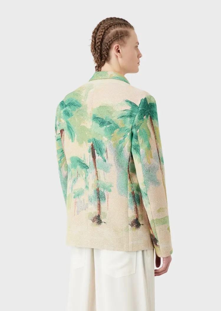 This EMPORIO ARMANI blazer adopts a lapel single-breasted version. The characteristic texture weaving and palm tree pattern reminds people of summer travel and play. It can easily create a holiday atmosphere and is suitable for matching with other items in the same series.