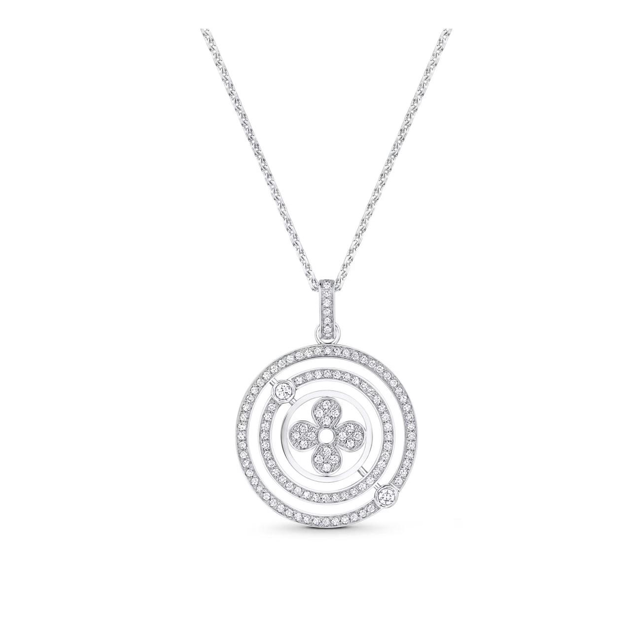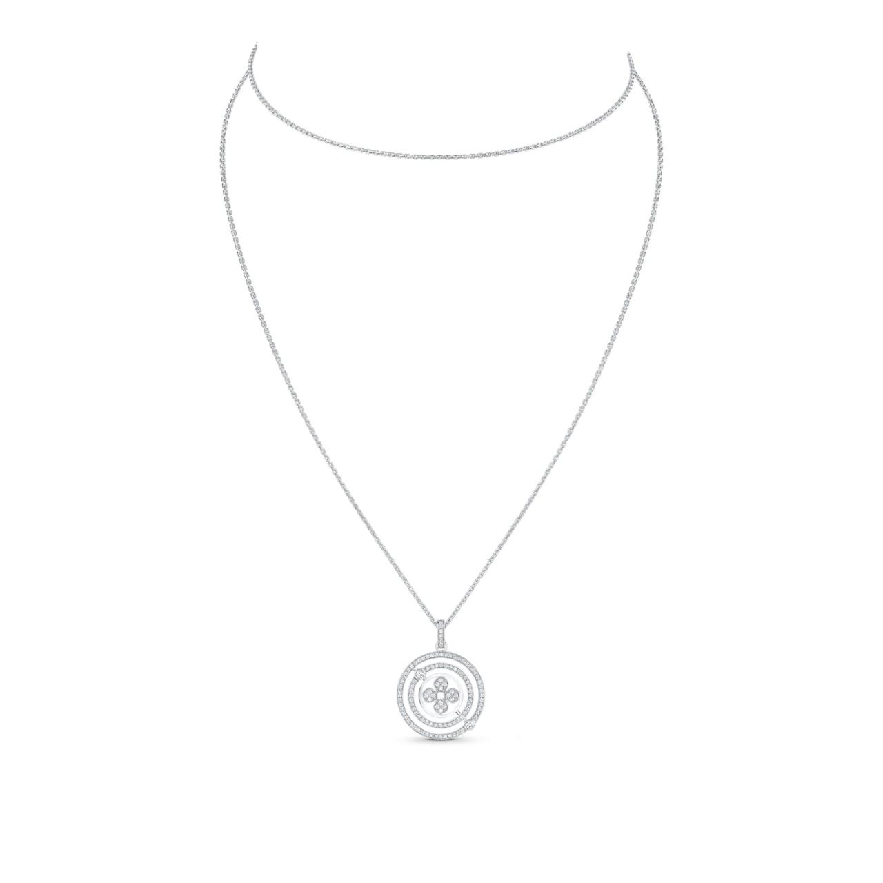 The Idylle Blossom collection pays tribute to the Monogram Flower, with modern pieces like this medallion necklace, cast from 18-karat white gold and illuminated with brilliant diamond pavé. With an adjustable chain that allows for different stylings, this elegant yet playful jewel can be worn alone or layered with other models from the Idylle Blossom line.
