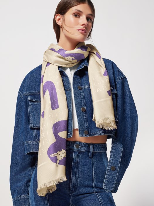 CELEBRATE THE LUNAR NEW YEAR IN A PLAYFUL WAY WITH THE LETTERE MAXI RABBIT SHAWL IN FINE SILK WOOL IN IVORY OPAL COLOUR. THE DESIGN IS NOVEL, AND THE COLORFUL BULGARI LOGO IS EMBELLISHED WITH THE IMAGE OF A CHEERFUL AND LEISURELY BUNNY, INTERPRETING THE ICONIC BULGARI BULGARI BRAND LOGO PATTERN IN A UNIQUE AND MODERN WAY. AVAILABLE IN A VARIETY OF STYLING OPTIONS, IT CAN BE STYLED AROUND THE NECK OR DRAPED OVER THE SHOULDERS. 70 X 180 CM - 27.6 X 70.8 INCHES. HANDMADE IN ITALY