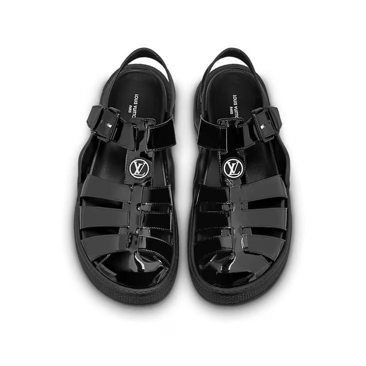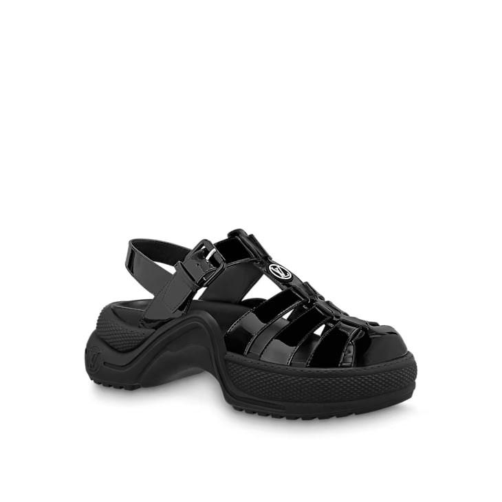 Crafted from high-shine patent calf leather, the LV Archlight flat sandal is an avant-garde style which adopts the oversized, wave-shaped outsole of the cult LV Archlight sneaker. On this version, the outsole is matched to the upper for a bold, colorblock look. A rubber LV Circle logo signs the sandal's front strap.