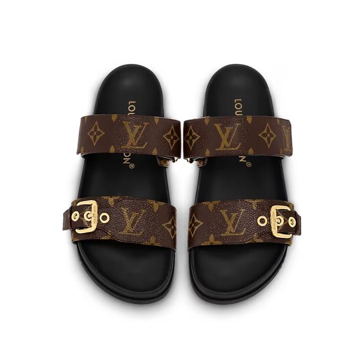 The Bom Dia flat comfort mule combines fashion and function in Louis Vuitton's signature Monogram canvas. This model is notable for its two adjustable straps: one with velcro, the other with an engraved, gold-tone buckle. An anatomic insole and a slip-resistant rubber outsole complete this effortless, on-trend style.