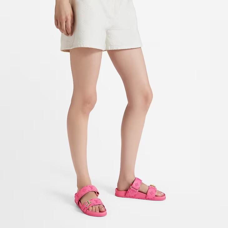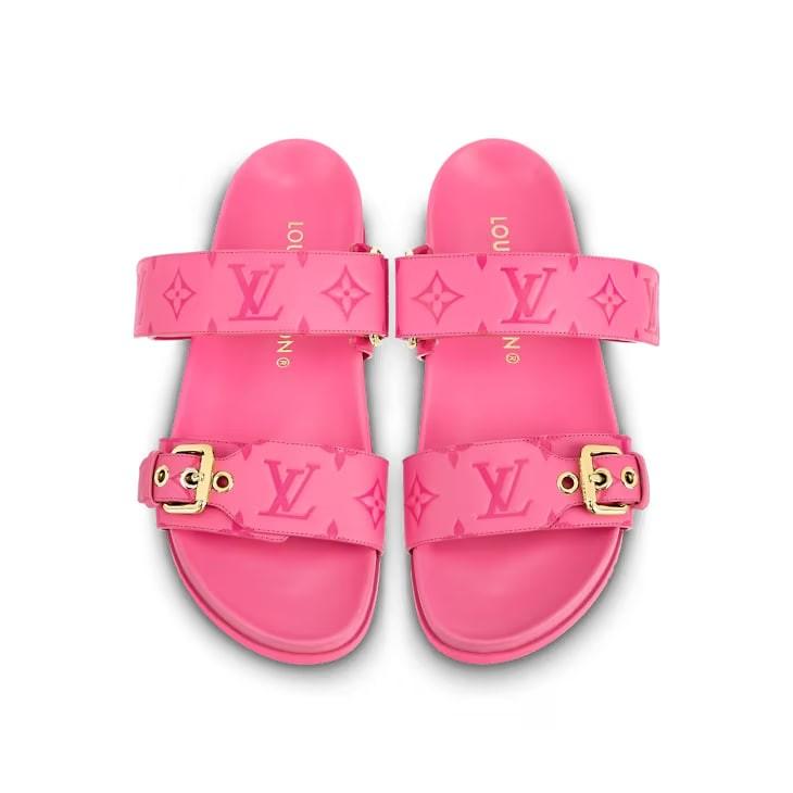 The Bom Dia flat mule comes in colorful Monogram-embossed calf leather for a fresh, summery look. This easy-to-wear style features two practical, adjustable straps: one with velcro, the other with a gold-tone buckle engraved with the Louis Vuitton signature. The slip-resistant rubber outsole coordinates with the upper for a bright, colorblock effect.