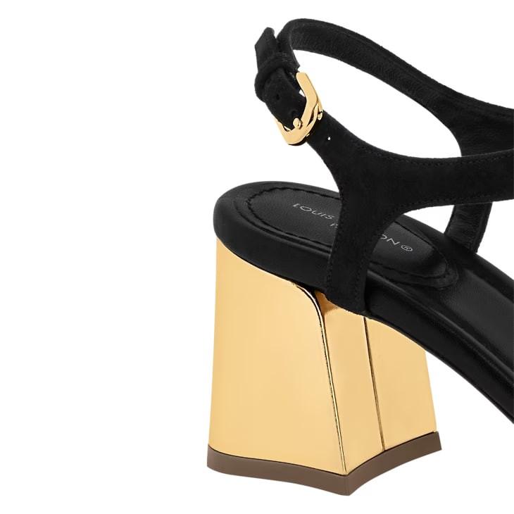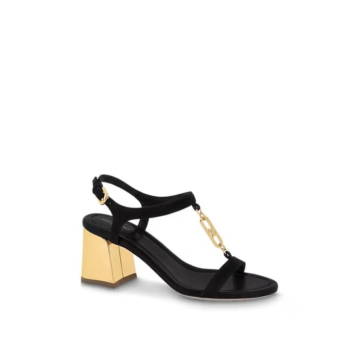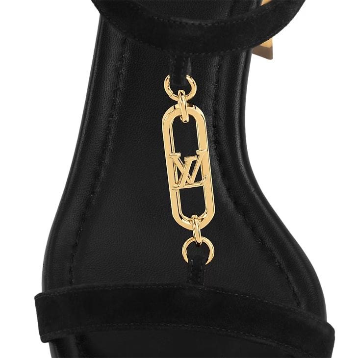 The Dita sandal contrasts the velvety texture of suede baby goat leather with shiny, gold-tone details: a precious LV Initials chain inspired by the jewelry collection and metallic calfskin on the heel. The upper is distinguished by its slender straps, which are complemented by a flared block heel. A fine leather outsole completes this elegant, feminine design.