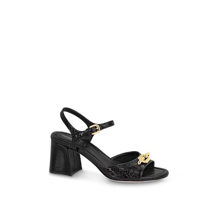 The LV Edge sandal is crafted from metallic calf leather with a distinctive crinkled finish. The front strap is accessorized with an angular, Monogram-engraved chain, which was inspired by the emblematic Coussin bag. This elegant model has a stable block heel, a comfortable lambskin insole and a supple leather outsole.