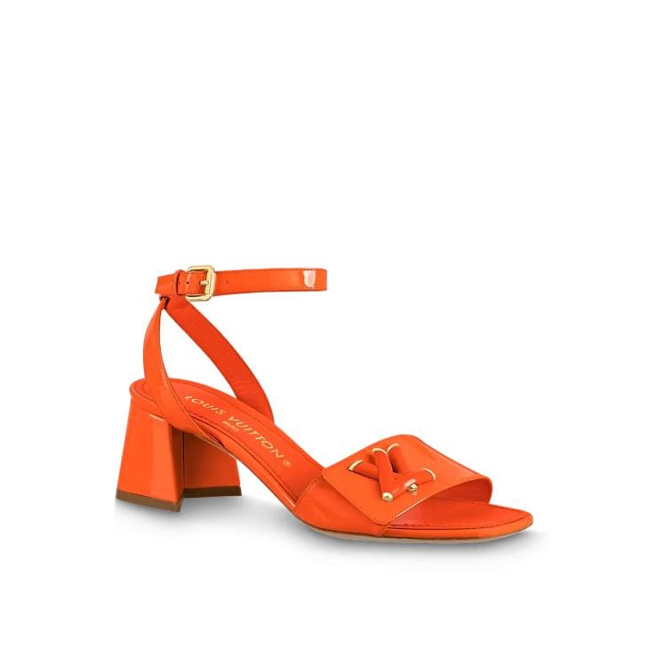 The Shake sandal comes in high-shine patent calf leather, which complements its striking, modern design. Key features are the tonal LV accessory on the front strap, which was inspired by the clasp of the Twist bag, and the graphic, V-shaped block heel. This model is finished with a slender ankle strap and a leather outsole.