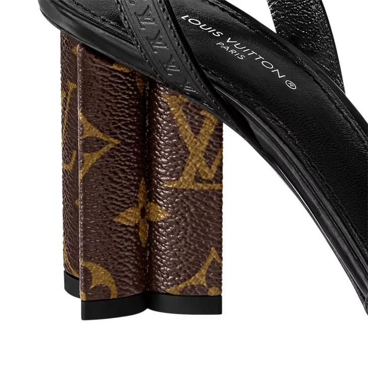 The Silhouette sandal is a refined style combining a calf leather upper with an iconic Monogram Flower-shaped heel covered with patent Monogram canvas. Key details evoke historic Louis Vuitton trunks: the tiny, gold-tone studs decorating the front strap, and the row of LV Initials discreetly embossed on the ankle strap.