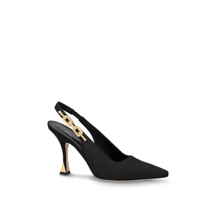 The Sparkle slingback pump is a sophisticated style crafted from Epi satin, which evokes the distinctive grain of the House's emblematic Epi leather. It is distinguished by its feminine pointed toe and flared heel with an LV Circle-engraved insert. The elasticized back strap is embellished with an angular, Monogram-engraved chain inspired by the Coussin bag.