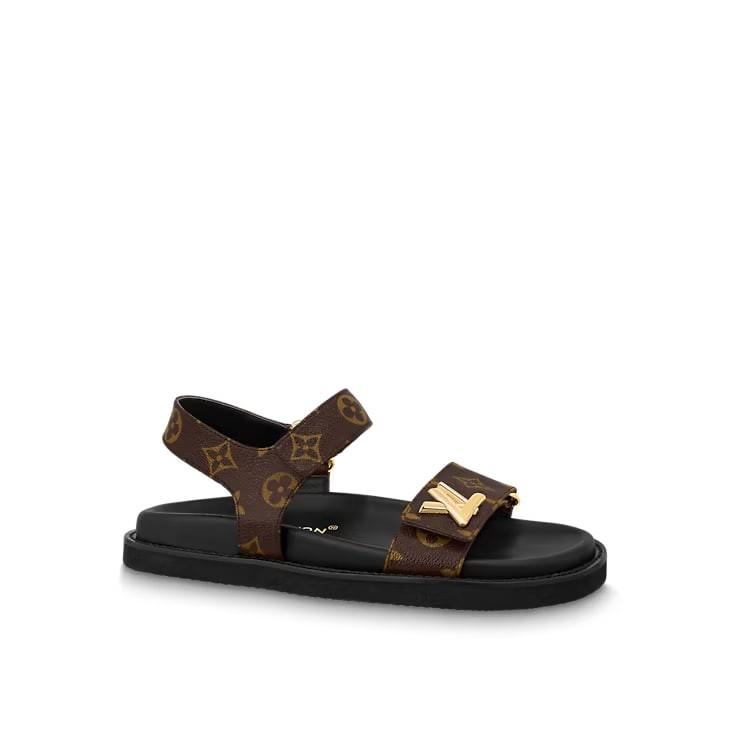 The LV Sunset flat comfort sandal is revisited in Louis Vuitton's signature Monogram canvas. Exceptionally pleasant to wear, this model has two adjustable velcro straps, one of which is embellished with a gold-tone LV accessory inspired by the Twist bag. An anatomic footbed and lightweight micro outsole complete this design.