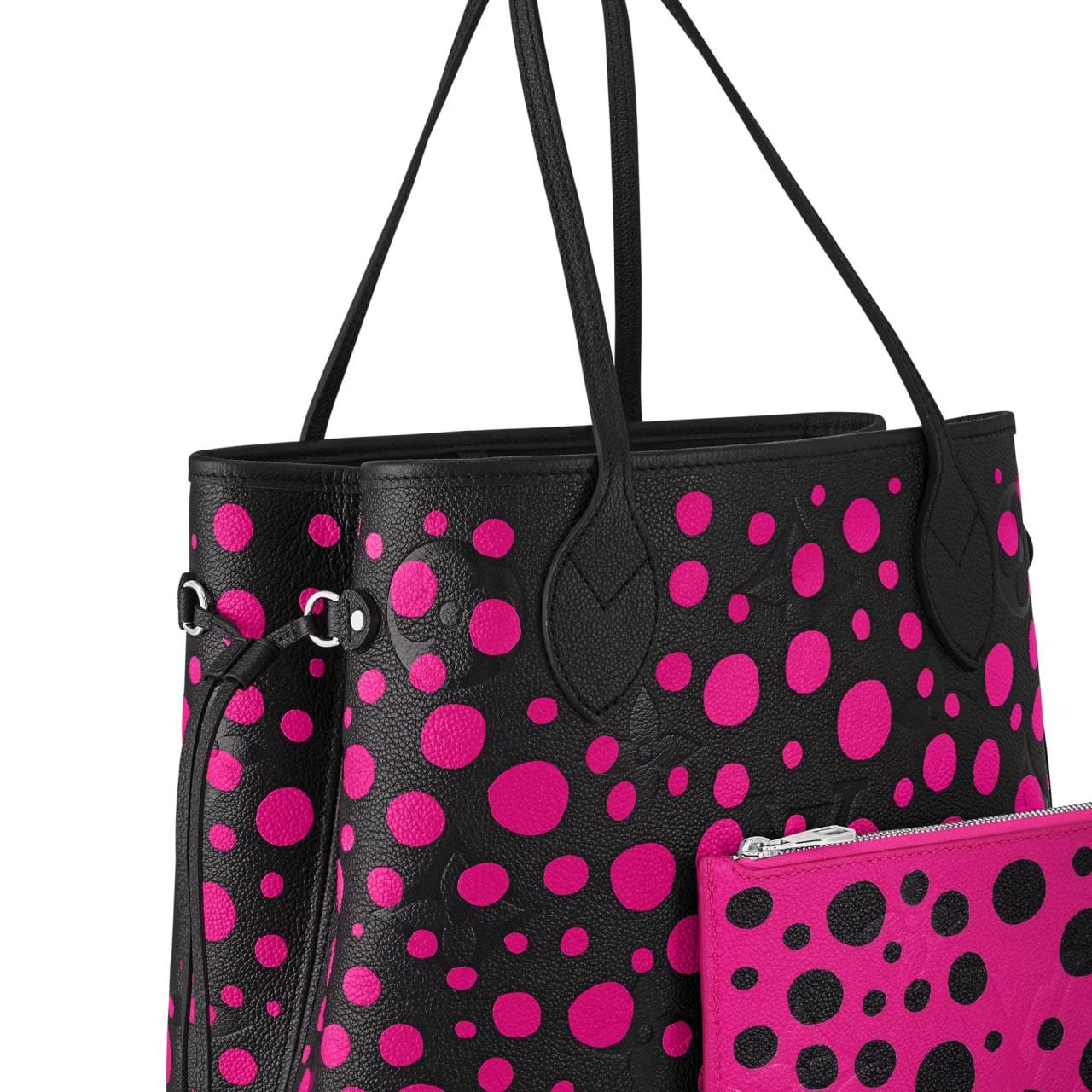 The LVxYK Neverfull MM joins the “Infinity Dots” theme of the major new Louis Vuitton x Yayoi Kusama collection. Endless arrays of dots are the Japanese artist’s ultimate visual signature, featured in her paintings, sculptures and performances since the beginning of her career. For this practical, capacious bag, bright fuchsia dots stand out against black Monogram Empreinte cowhide. And it comes with a pumpkin-shaped charm, echoing another of Kusama’s emblems.