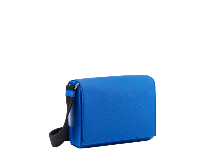 BULGARI BULGARI HOMME SMALL MESSENGER BAG IN OLYMPIC SAPPHIRE BLUE SMOOTH AND GRAINED METAL-FREE CALFSKIN WITH HOT-STAMPED BULGARI LOGO PATTERN AND OLYMPIC SAPPHIRE BLUE RECYCLED NYLON (ECONYL®) LINING FOR CONVENIENCE DESIGNED AND PRODUCED IN A SUSTAINABLE MANNER. EQUIPPED WITH A SHOULDER STRAP EMBROIDERED WITH THE BULGARI LOGO AND FEATURING A SINGLE COMPARTMENT, THE TIMELESS SHAPE EXUDES ELEGANCE AND SIMPLICITY. FEATURING A MAGNETIC FLAP, ONE BACK FLAT POCKET, TWO INNER FLAT POCKETS AND BULGARI METAL LOGO ON THE BACK. 22 X 18 X 8 CM - 8.7 X 7.1 X 3.1 INCHES. MADE IN ITALY.