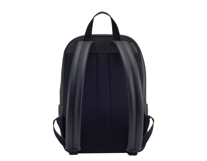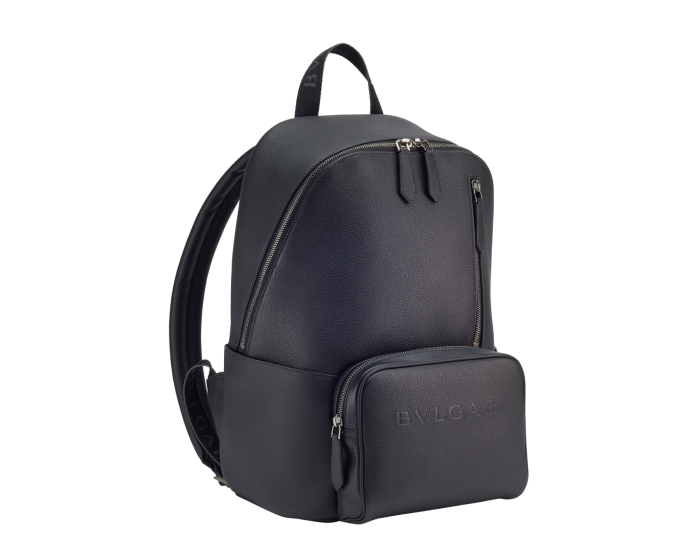 BULGARI MEN'S LARGE BACKPACK IN BLACK SMOOTH AND GRAINED METAL-FREE CALFSKIN WITH OLYMPIC SAPPHIRE BLUE RECYCLED NYLON (ECONYL®) LINING, DESIGNED AND CRAFTED IN A SUSTAINABLE WAY FOR A TIMELESS LOOK ELEGANT STYLE AND MINIMALIST DESIGN. FOIL-STAMPED SIGNATURE BULGARI LOGO ON THE FRONT, SINGLE COMPARTMENT, ZIP CLOSURE, TWO FRONT ZIPPED POCKETS, TWO SIDE OPEN POCKETS, BREATHABLE TECHNICAL BACK SUPPORT, ONE INTERNAL ZIPPED POCKET, ONE PADDED COMPUTER COMPARTMENT POCKETS. 29 X 40 X 20 CM - 11.4 X 15.7 X 7.9 INCHES. MADE IN ITALY.