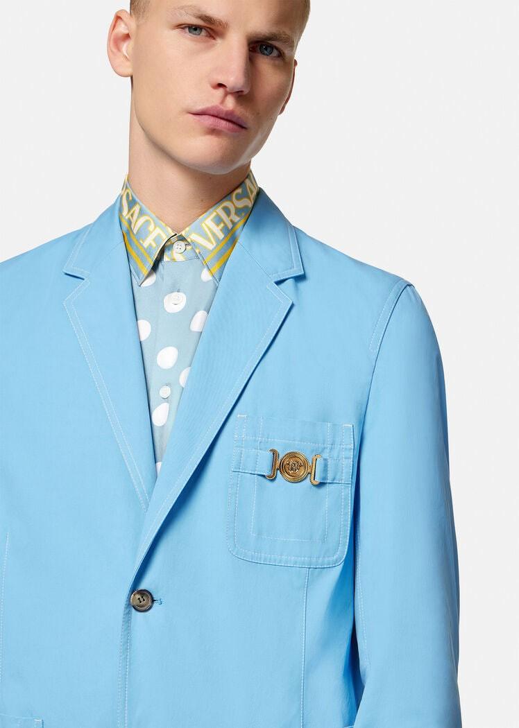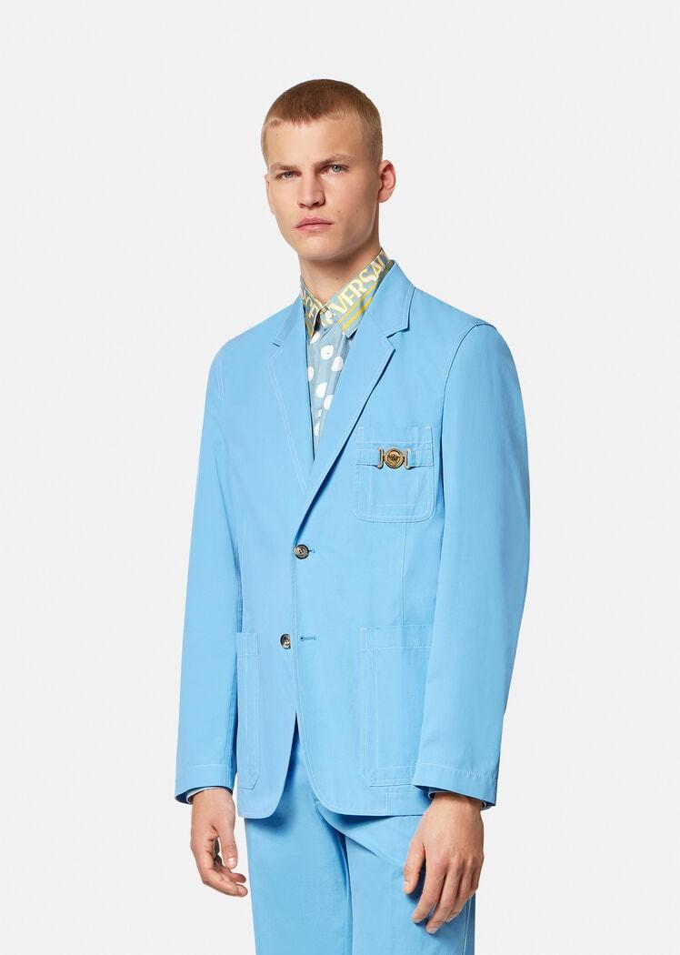 Slim fit blazer in lightweight cotton featuring a Medusa Biggie badge on the breast pocket. Jacket style featuring contrast stitching and multifunctional front patch pockets and side pockets.