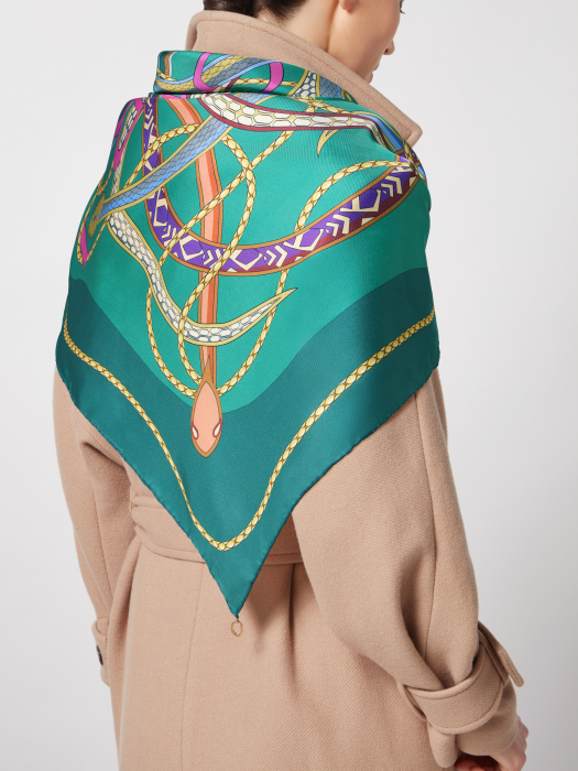 THE SERPENTI 75 SERIES BRIGHT GREEN FINELY PRINTED TWILL SILK SCARF, PAIRED WITH THE BVLGARI BVLGARI SERIES METAL PENDANT, PAYS TRIBUTE TO THE 75TH ANNIVERSARY OF THE BULGARI CLASSIC SERIES THAT SYMBOLIZES ENDLESS TRANSFORMATION. THE PRECIOUS SNAKES ARE INTERTWINED AND INTERTWINED, WINDING AROUND THE ICONIC SERPENTINE CHAIN OF BULGARI BULGARI LEATHER WORKS-THIS PATTERN CLEVERLY INTERPRETS THE CREATIVE CHARM AND FASCINATING TRANSFORMATION OF THE SERIES FOR 75 YEARS. THIS VERSATILE PIECE CAN BE STYLED IN DIFFERENT STYLES: TIED AROUND THE NECK FOR A TIMELESS LOOK; TIED AROUND THE WAIST FOR A FEMININE BELT; TIED AS A HAIR ACCESSORY FOR A STYLISH LOOK; OR ADORNED WITH A HANDBAG FOR A PERSONALIZED LOOK. 90 X 90 CM - 35.4 X 35.4 INCHES. 100% SILK TWILL. HANDMADE IN ITALY.