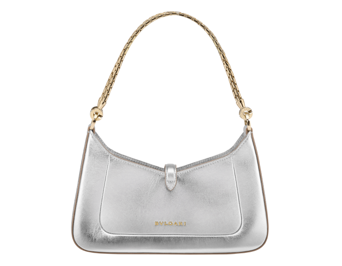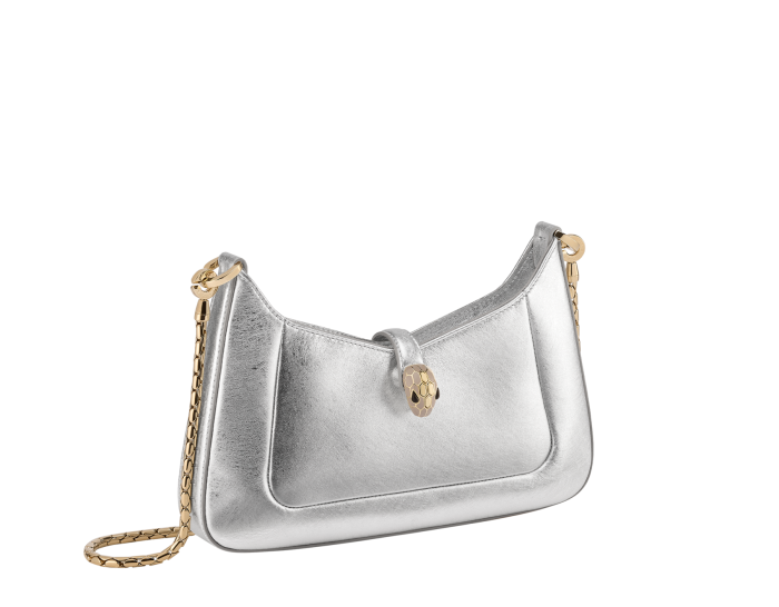 A CONTEMPORARY INTERPRETATION OF TIMELESS MASTERPIECES, THE SERPENTI BAIA SMALL SHOULDER BAG IS CRAFTED IN SILVER TEXTURED CALFSKIN WITH A METALLIC FINISH AND DELICATE GRAINING REMINISCENT OF THE BEAUTIFUL INCLUSIONS IN ROUGH DIAMONDS. THE HANDBAG IS VERSATILE AND CHANGEABLE, ADDING FASHIONABLE CHARM TO DAYTIME LOOKS. IT IS EQUIPPED WITH TWO DETACHABLE SNAKE-SHAPED THICK CHAINS AND AN ADDITIONAL CHAIN DEVICE, WHICH CAN BE EXTENDED AT WILL TO ACHIEVE A VARIETY OF WEARING STYLES. THE PIECE IS ADORNED WITH THE SIGNATURE MAGNETIC SNAKEHEAD CLOSURE, WHOSE CAPTIVATING SCALES AND DESIGN ARE INSPIRED BY THE SERPENTI JEWELRY LINE OF THE 1960S. FEATURING ONE SINGLE COMPARTMENT, TOP ZIP CLOSURE, ONE INTERNAL OPEN FLAT POCKET AND METAL BULGARI LOGO ON THE BACK. 27.5 X 18 X 4.5 CM - 10.8 X 7.1 X 1.8 INCHES. MADE IN ITALY.