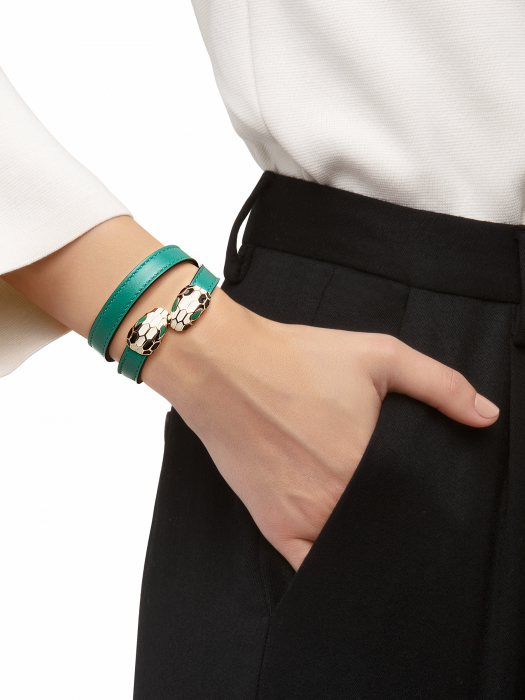 SERPENTI FOREVER DOUBLE-WRAP BRACELET IN EMERALD GREEN CALFSKIN. WITH A CHARMING SINGLE STUD CLASP, THE ICONIC PAIR OF SNAKES FACING EACH OTHER, THE SEDUCTIVE COLORED SCALES AND DELICATE DESIGN ARE INSPIRED BY THE CLASSIC SERPENTI JEWELRY OF THE 1960S, MAKING THIS BRACELET AN IDEAL ACCESSORY FOR DAY AND NIGHT. 16.5 CM - 6.5 INCHES (WRIST CIRCUMFERENCE). MADE IN ITALY.