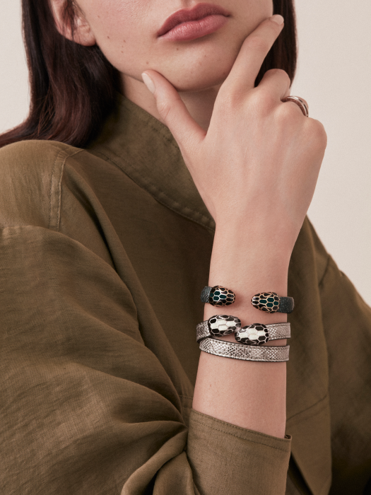 SERPENTI FOREVER" MULTI-COIL BRACELET IN OPAL OPAL METALLIC WATERSNAKE LEATHER WITH BRASS LIGHT GOLD PLATED HARDWARE. THE CLASSIC PAIR OF SNAKE HEADS IN BLACK AND SHIMMERING OPAL ENAMEL FACE EACH OTHER, WITH BLACK ENAMEL EMBELLISHING THE EYES. SMALL. 38.5 CM - 15.1 INCHES