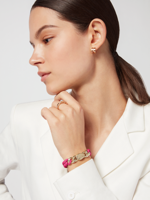 SERPENTI FOREVER MAXI CHAIN BRACELET IN BRASS LIGHT GOLD PLATED, PARTIALLY ADORNED WITH BEET RED SPINEL FUCHSIA ENAMEL, COMBINING A THICK "GOURMETTE" (CHAIN) CHAIN INSPIRED BY PIECES OF HIGH JEWELRY WITH A SEDUCTIVE SNAKE DETAIL PENDANT DECORATED. AT THE CENTER OF THE PIECE IS THE CAPTIVATING CLASSIC SNAKE HEAD, A CHARMING INTERPRETATION OF THE COLLECTION'S SIGNATURE DECORATION, INSPIRED BY A BULGARI WATCH FROM THE 1960S. ADJUSTABLE BUCKLE. 15.5 - 17.5 CM; 6.1 - 6.9 INCHES (FOR WRIST). MADE IN ITALY.