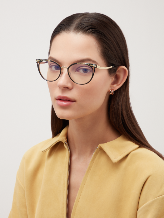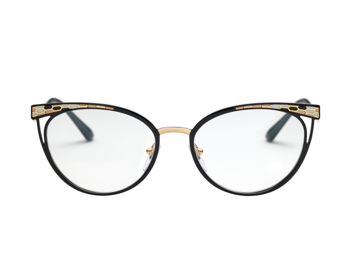 SERPENTI "COLORHAPSODY" GLASSES WITH PHANTOS METAL FRAME AND BLUE LIGHT BLOCKING LENSES. THESE GLASSES FEATURE A MESMERIZING KALEIDOSCOPE PATTERN OF ENAMELED MINIATURE SCALES. THE ANTI-BLUE LIGHT LENSES CAN BE REPLACED WITH MEDICAL LENSES IF NEEDED