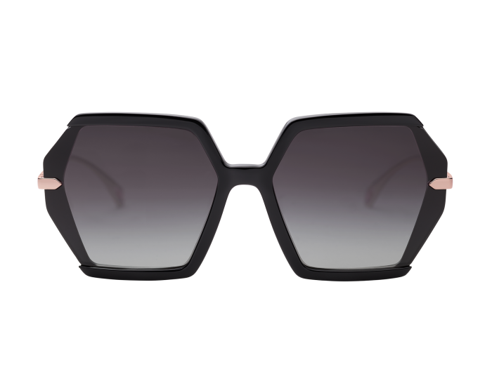 SERPENTI TRUE COLOURS SUNGLASSES WITH GRAY LENSES AND BLACK ACETATE HEXAGONAL FRAME COMPLEMENTED BY LIGHTWEIGHT METAL TEMPLES. THE TEMPLE TIPS ARE DECORATED WITH CLASSIC SCALES IN MAGENTA ENAMEL, BRINGING THIS CHARMING PIECE TO LIFE