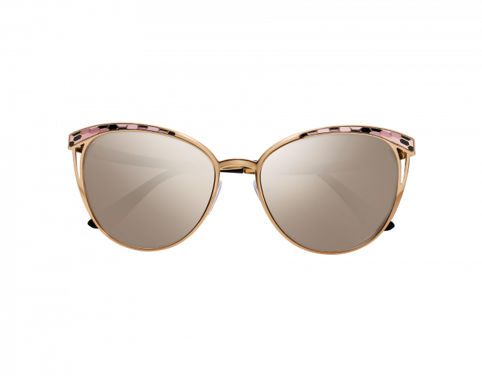 THE STYLISH CAT-EYE METAL FRAME IS PAIRED WITH SINUOUS TEMPLES REMINISCENT OF SNAKES IN A PLAYFUL AND ALLURING COLOR COMBINATION. THE ENAMEL SNAKE SCALE FINISH AND MIRRORED LENSES FURTHER ADORN THE EYES AND BECOME A UNIQUE SYMBOL OF THE BRAND.