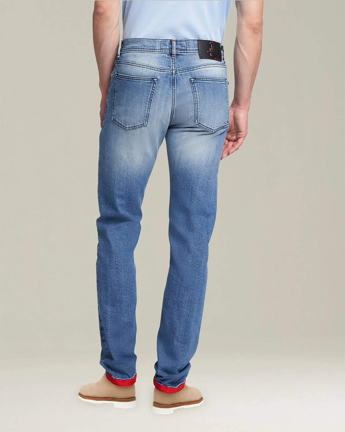 Light blue wash slim-fit five-pocket jeans in Kurabo, the finest Japanese denim there is, made from organic cotton woven on vintage American machinery. An icon of relaxed, contemporary elegance, Kiton jeans offer lightweight durability thanks to double stitching, making them nearly indestructible. A small amount of elastane in their composition makes these jeans extremely comfortable: the fabric gently hugs the leg without losing its shape. Sewn without darts, these trousers have tone-on-tone topstitching, red bar tacks, and red kick tape to reinforce the hem. Essential lines define this versatile garment, designed to enrich casual-chic and sporty looks. The opening of the leg is 19.5 cm on a base size of 50 (Italian). We recommend hand washing inside-out at 30 C.